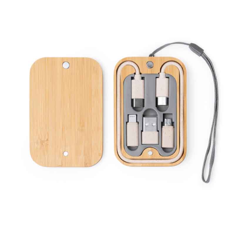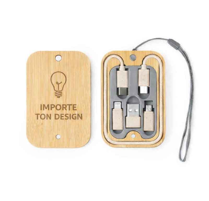 Ensemble de câbles de charge dans un étui en bambou